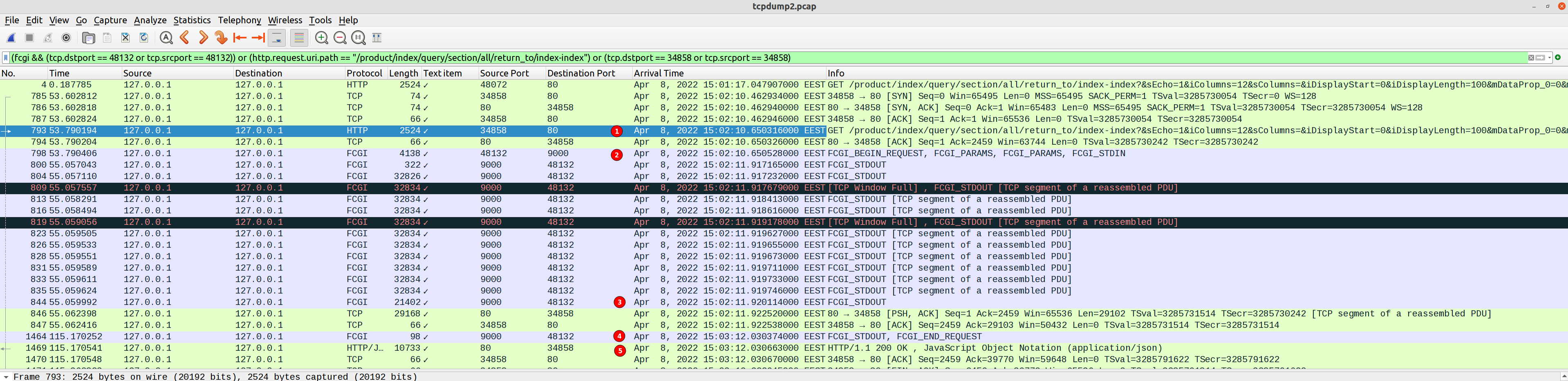 要注意的是,lat FCGI_STDOUT数据包延迟了50+秒,它包含几个字节(在本例中是json结束标记“]}”):