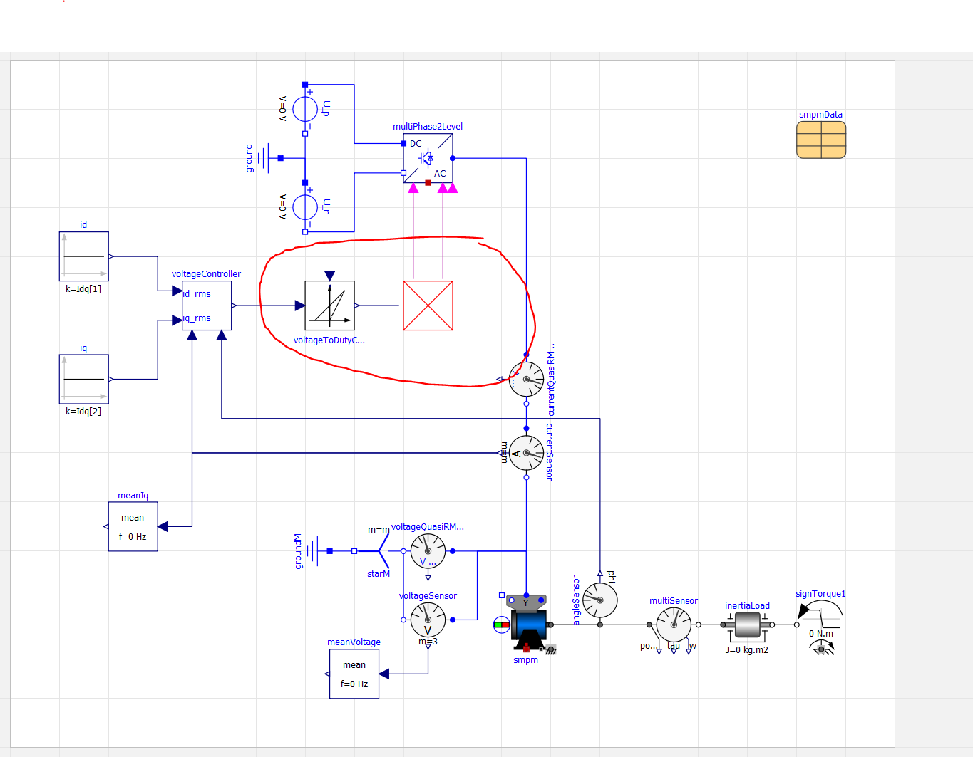 我试图用VoltageController和OpenModelica中的脉宽调制来模拟SMPM。在寻找关于这个主题的旧线程之后,我找到了一个:PI-Controller doesn't reach reference value with inverter and PMSM in Modelica