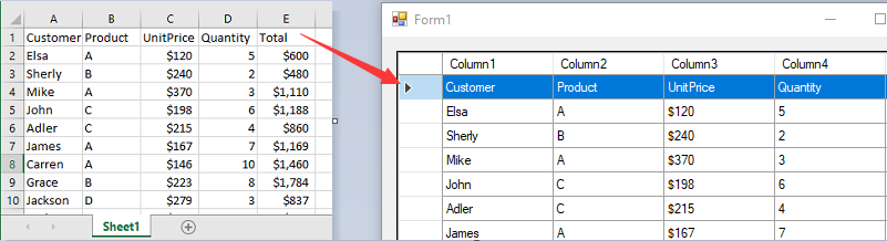 可以使用ExportDataTable(CellRange range, )类的Spire.Xls.Worksheet方法将工作表数据读入数据表,并确定是否将工作表范围中的第一行作为数据表中的标题行导出。
