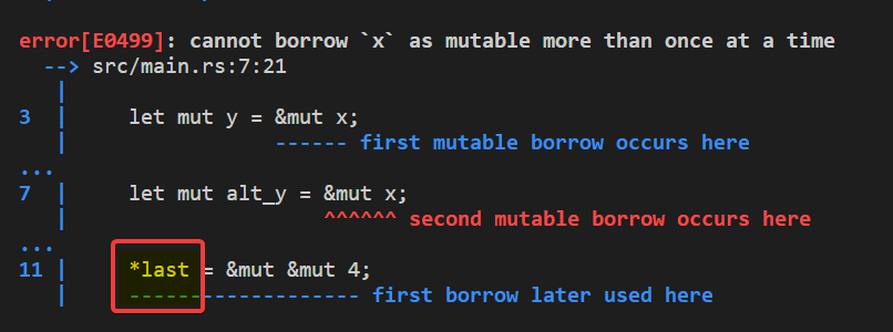 在第二种情况下,生锈编译器会看到可变引用last被取消引用,因此它被视为值访问。正如我们所知,铁锈不允许这两个可变的借款。