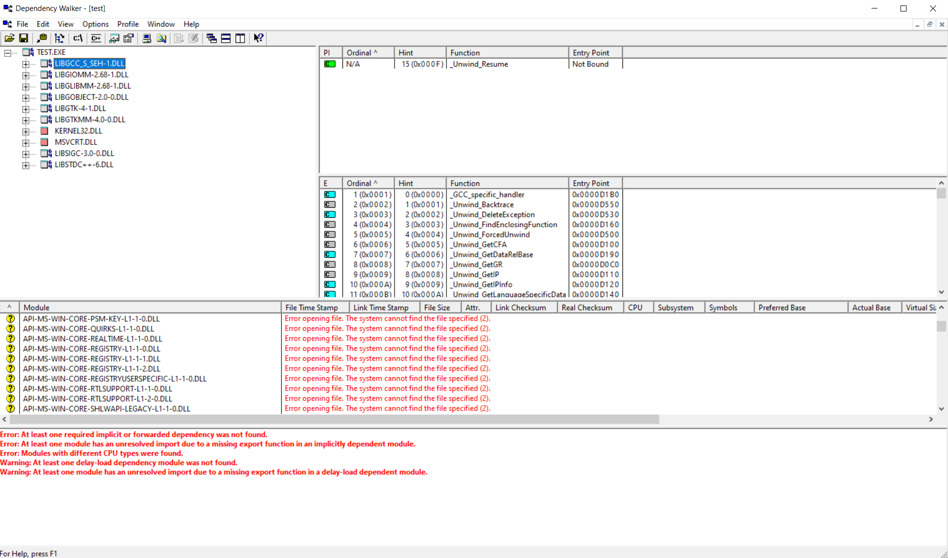 Edit2:我对Dependency做了一些研究,它似乎有一些已知的问题,所以我也用这个输出运行了lucasg的"Dependencys“计划。我还是不太清楚这意味着什么,但这似乎很好。