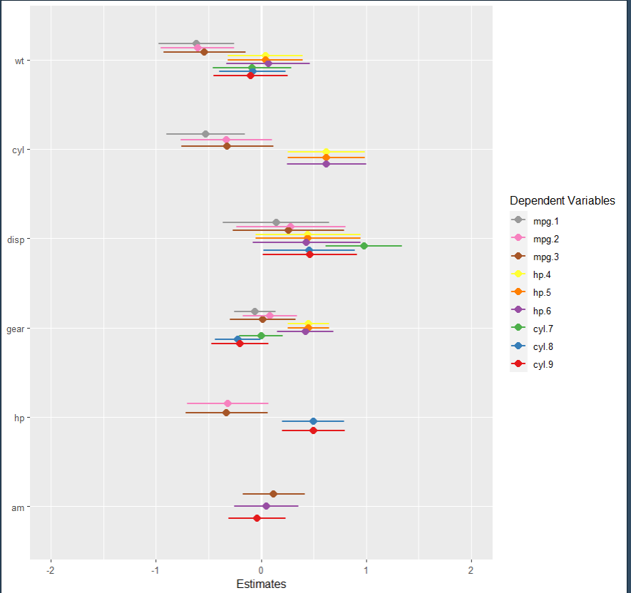 如何在估计图中编码所有将MPG称为蓝色的因变量、将hp称为绿色的所有因变量以及将cyl称为黄色的所有因变量?那么标签应该相应更新吗?