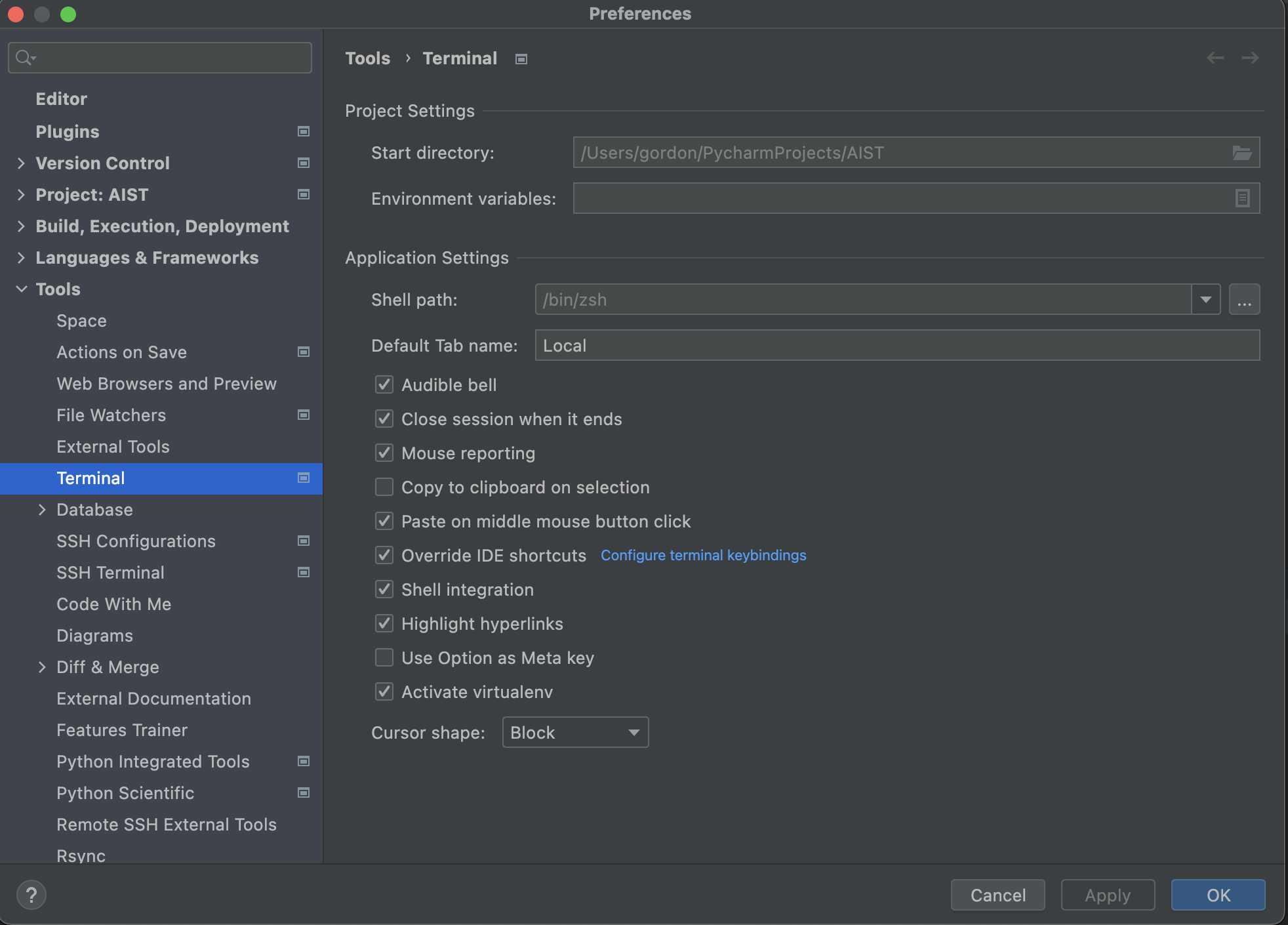 以上是我为PyCharm终端设置的页面。我检查了“激活虚拟主机”。
