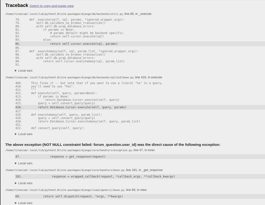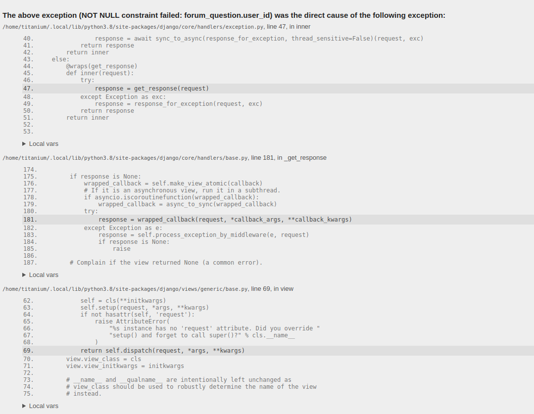 追溯(最近一次调用):文件"/home/titanium/.local/lib/python3.8/site-packages/django/core/handlers/exception.py",行47,在内部响应=get_response(请求)文件"/home/titanium/.local/lib/python3.8/site-packages/django/core/handlers/base.py",行181中,在_get_response response = wrapped_callback(request,*callback_args,)文件"/home/titanium/.local/lib/python3.8/site-packages/django/views/generic/base.py",第69行,在调度返回处理程序(请求,*args,*args)中,查看返回self.dispatch(请求,*args,**kwargs)文件"/home/titanium/.local/lib/python3.8/site-packages/django/views/generic/base.py",行101**kwargs)文件"/home/titanium/.local/lib/python3.8/site-packages/django/views/generic/edit.py",行174,在post返回超级().post(请求,*args,**kwargs)文件"/home/titanium/.local/lib/python3.8/site-packages/django/views/generic/edit.py",行144,在post返回文件(表单) "/home/titanium/.local/lib/python3.8/site-packages/django/views/generic/edit.py",第127行,在form_valid self.object = form.save()文件"/home/titanium/.local/lib/python3.8/site-packages/vote/models.py",第466行,在保存self.instance.save()文件“/home/titanium/.local/lib/python3.8/site-packages/vote/models.py”,第67行,在保存超级( "/home/titanium/.local/lib/python3.8/site-packages/django/db/models/base.py",,self).save(*args,**kwargs)文件第743行中,在保存self.save_base(using=using,force_insert=force_insert,File "/home/titanium/.local/lib/python3.8/site-packages/django/db/models/base.py",第780行)中,在"/home/titanium/.local/lib/python3.8/site-packages/django/db/models/base.py",save_base = self._save_table(文件save_base第885行)中,在_save_table结果= self._do_insert(cls._base_manager,raw,字段,returning_fields,raw)中,文件"/home/titanium/.local/lib/python3.8/site-packages/django/db/models/base.py",行923,在"/home/titanium/.local/lib/python3.8/site-packages/django/db/models/manager.py",返回manager._insert(文件_do_insert第85行)中,在manager_method返回getattr(self.get_queryset(),name)(*args,**kwargs)文件"/home/titanium/.local/lib/python3.8/site-packages/django/db/models/query.py",行1301,在返回query.get_compiler(using=using).execute_sql(returning_fields)文件"/home/titanium/.local/lib/python3.8/site-packages/django/db/models/sql/compiler.py",第1441行,在execute_sql cursor.execute(sql,params)文件"/home/titanium/.local/lib/python3.8/site-packages/django/db/backends/utils.py",第99行,在执行返回超级().execute(sql,文件"/home/titanium/.local/lib/python3.8/site-packages/django/db/backends/utils.py",第67行,在执行返回self._execute_with_wrappers(sql,params,many=False,executor=self._execute)文件"/home/titanium/.local/lib/python3.8/site-packages/django/db/backends/utils.py",第76行中,在_execute_with_wrappers返回执行器(_execute_with_wrappers,params,多,(上下文)文件"/home/titanium/.local/lib/python3.8/site-packages/django/db/backends/utils.py",行85,在_execute返回self.cursor.execute(sql,params)文件self.cursor.execute第90行中,在从"/home/titanium/.local/lib/python3.8/site-packages/django/db/backends/utils.py",文件"/home/titanium/.local/lib/python3.8/site-packages/django/db/backends/sqlite3/base.py",行85、_execute返回self.cursor.execute(sql,params)文件第416行、执行返回Database.Cursor.execute(self、query,django.db.utils.IntegrityError: NULL约束失败: forum_question.user_id 14/Apr/2022 09:58:02 "POST /ask/ HTTP/1.1“500 175023