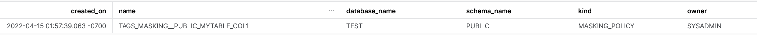 ALTER TABLE IF EXISTS public.mytable MODIFY COLUMN col1 SET MASKING POLICY TAGS_MASKING__public_mytable_col1; 检查: