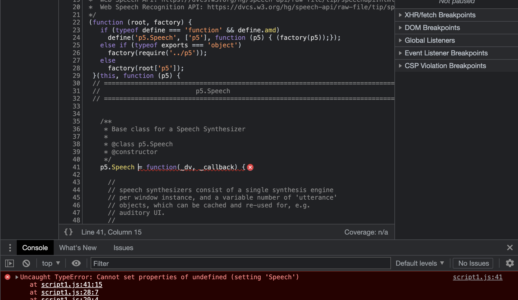 有谁知道为什么p5. p5.Speech在这里没有定义,以及我如何纠正这个问题?我正在尝试构建一个应用程序来执行语音识别,然后调用一个函数,但不幸的是,我无法在这个错误的情况下做到这一点。