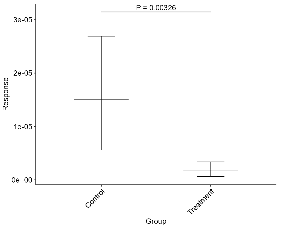 在对我的数据执行rstatix::wilcox_test()之后,我自动添加了y.position值,以便使用rstatix::add_xy_position()绘制p值。然后,我绘制了数据并使用ggpubr::stat_pvalue_manual()添加了p值。问题是,y.position值被错误地定义为零,导致所绘制的p值和括号geom出现在y-轴底部的零位置,而此时它应该出现在y-轴顶部附近。rstatix的文档表明,按max默认设置计算的y.position值应该等于max(data$Response) = 0.00008556344,而不是零。我是不是不正确地使用这些函数?如果不是,如何才能使p值和括号geom出现在对应于最大值的y轴数据值上?