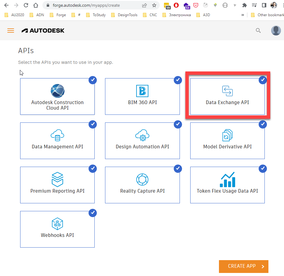 在创建Forge应用程序时,请确保数据交换API的选择如下所示:
