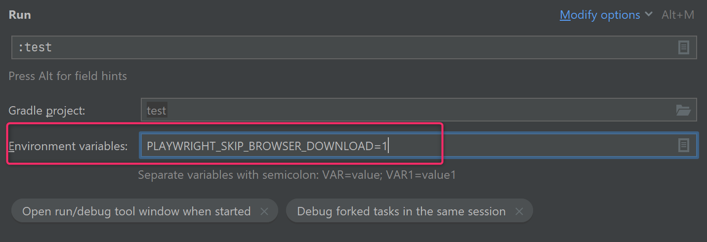 PLAYWRIGHT_SKIP_BROWSER_DOWNLOAD=1IntelliJ IDE运行配置