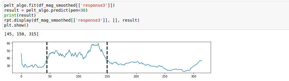 当使用PELT算法检测以下图片的变化点时,如何获得最优惩罚的值?它需要30的惩罚,数据集的长度为315个样本: