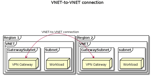 ·在不同位置连接两个VNET的第二种方法是使用VNET到-VNET连接。VNET到VNET的连接本质上是两个不同Azure位置之间的VPN .VNET到VNET连接建立在VPN网关上.这意味着与全局VNET对等(两端的两个网关)相比,您的流量将产生两个额外的流量跃变。这也意味着您将招致额外的延迟,而VPN网关可能会成为带宽瓶颈。使用VNET到VNET连接的一个好处是,不同Azure区域之间的通信将使用IPSEC加密。VNET窥视以未加密的方式在Microsoft主干网上运行,而VNET到VNET连接则使用IPSEC将两个VNET连接在一起。有关上述情况的说明如下: