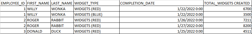 无论颜色如何,我需要计算一名员工在给定的一天中创建了7,000多个小部件的次数。因此,当完成日期相同时,它将对Total_widgets_created进行求和,然后考虑计数结果的和。
