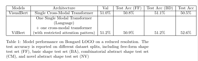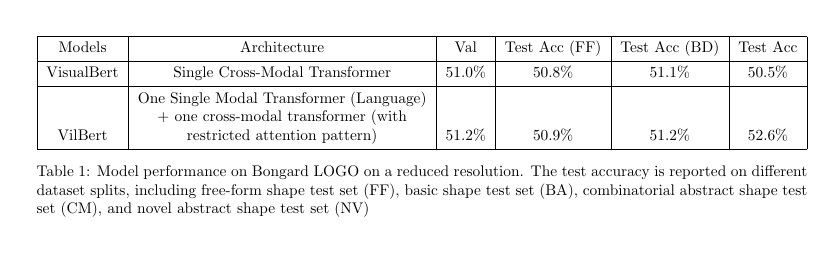 \caption{Model performance on Bongard LOGO on a reduced resolution. The test accuracy is reported on different dataset splits, including free-form shape test set (FF), basic shape test set (BA), combinatorial abstract shape test set (CM), and novel abstract shape test set (NV)}