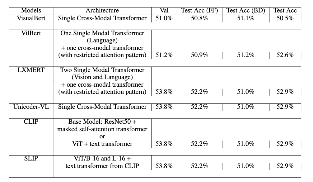 VisualBert & Single Cross-Modal Transformer & 51.0\% & 50.8\% & 51.1\% & 50.5\% \\\\ \hline