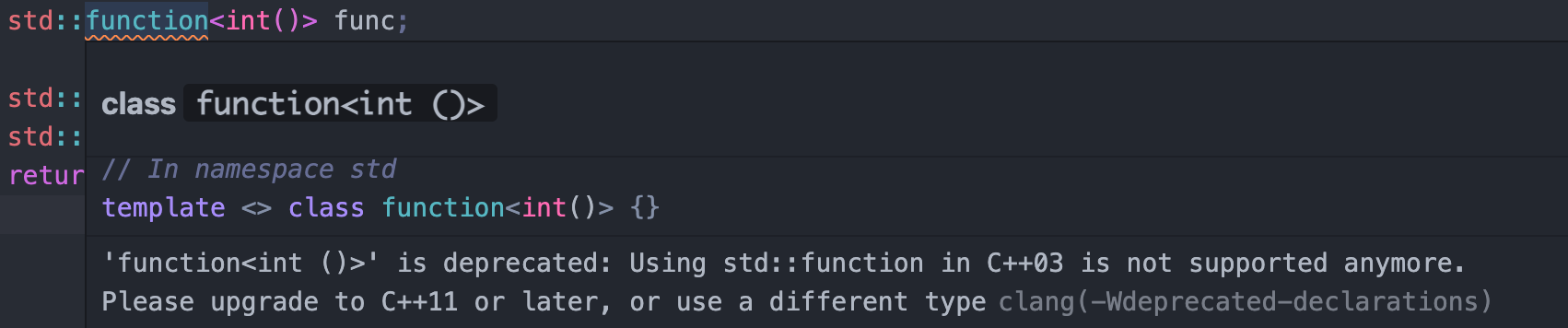 不幸的是,它似乎正在C++98中运行。在使用诸如std::function之类的基本内容时,我会得到以下错误