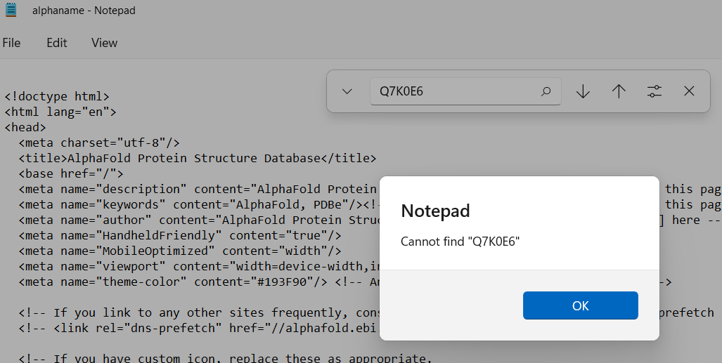 一旦我有了uniprot (在本例中显示为Q7K0E6),我就可以导航到字母表条目页面,并访问文件服务器来下载该蛋白质的PDB文件,我已经能够成功地对我一直在使用的数据库中具有注册uniprot的蛋白质执行该文件。