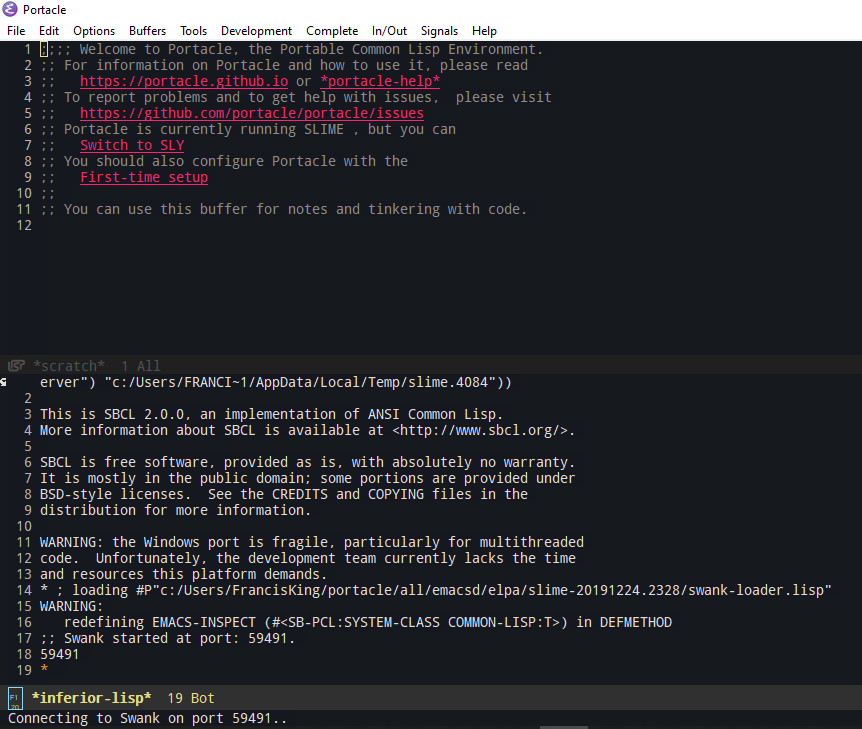 我在Windows 10上安装了Portacle。它有时工作正常,有时不工作。当Portacle启动并试图连接到Swank时,问题就会发生。Emacs冻结,我无法在编辑窗口中编辑任何内容(因此,对不起,我不能复制消息来显示您)。Emacs编辑器如下所示: