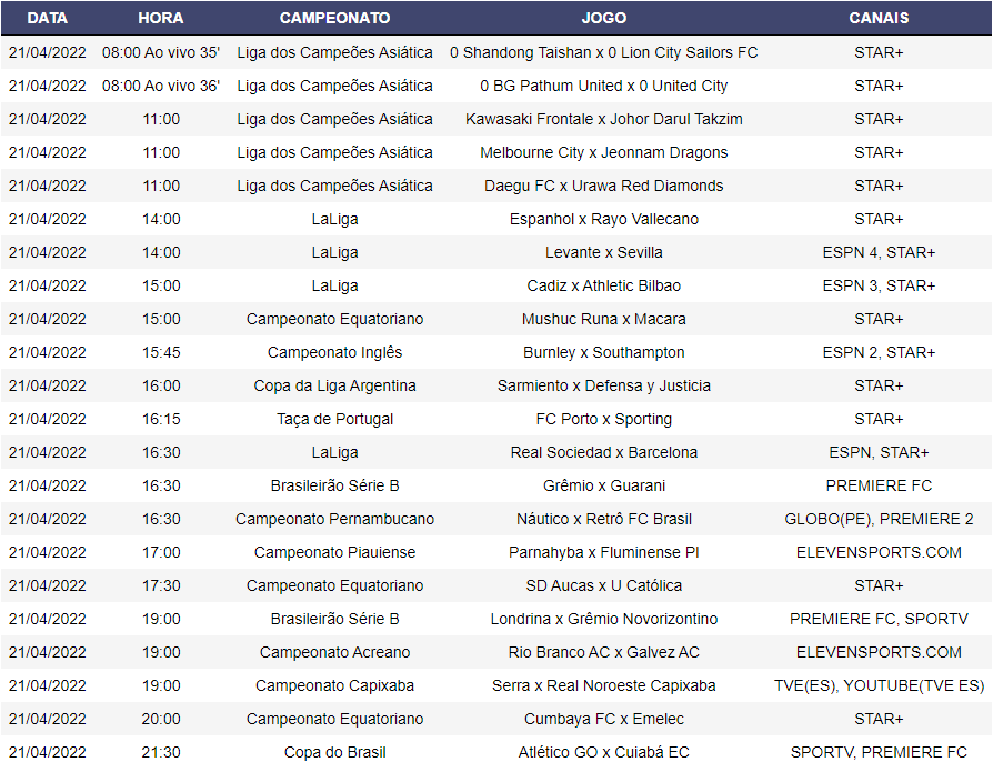 21/04/2022,"08:00 Ao vivo 77'",Liga dos Campeões Asiática,0 Shandong Taishan x 0 Lion City Sailors FC,STAR+