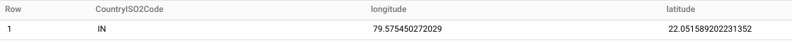 在BigQuery中,给定一个国家的ISO-2代码,我需要得到它的质心坐标(lat和long)。有办法这么做吗?看着地理功能的烧烤,我没有找到一个方法。