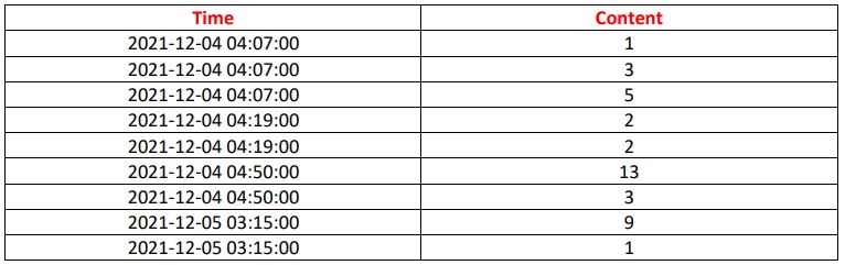 df2[df2.Content.notna()].reset_index()Shuvashish已经显示了pd.Grouper -我只是爆炸了结果,并将原点设置为第一次值“溢出”到分钟-顺便说一下,不应该有04:50:00的时间,因为我们从奇数04:07:00开始每2分钟一次。