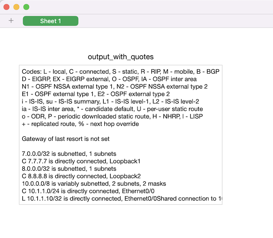 L 10.1.1.10/32 is directly connected, Ethernet0/0Shared connection to 10.1.1.10 closed.我需要接受这个输出并将其放入一个excel文件中,但问题是:我上面粘贴的整个输出应该进入excel (或csv)文件的单列/行。