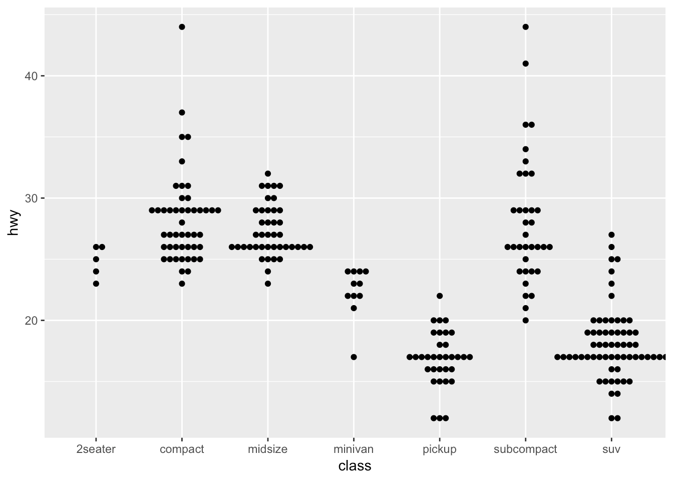 geom_jitter(width = 0.1)或者,您考虑过使用小提琴情节吗?它可以更有效地显示分布的密度,因为绘图的宽度与该级别周围数据点的比例成正比(对于y轴)。