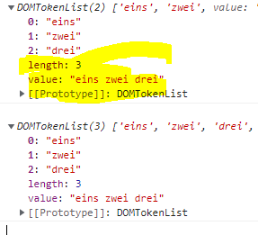 关于DomTokenList的控制台输出(通常是活动列表),我有一个问题。为什么第一个控制台输出也显示了3个值,而不是2个。尽管后来我添加了第三个类。我已经设置了一个超时,但是结果是一样的。
