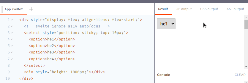 在Chrome中打开这个REPL (在火狐中没有问题)- https://svelte.dev/repl/b739483ffedc4e33bc4f6f2626c013ff?version=3.47.0