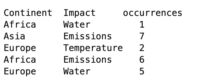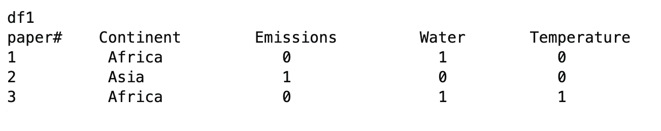 我在R中有一个数据,其中每一个观察都是一篇论文。“大陆”栏表示论文所关注的大陆,“影响”栏表示它提到的“影响”(0表示未提及)。