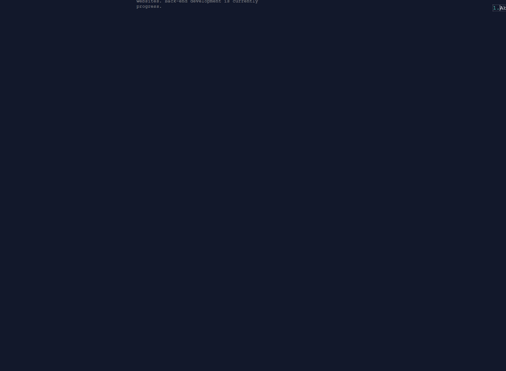 <p>I'm an aspiring software engineer. I like to build<br>websites. Back-end development is currently <br>progress.</p>