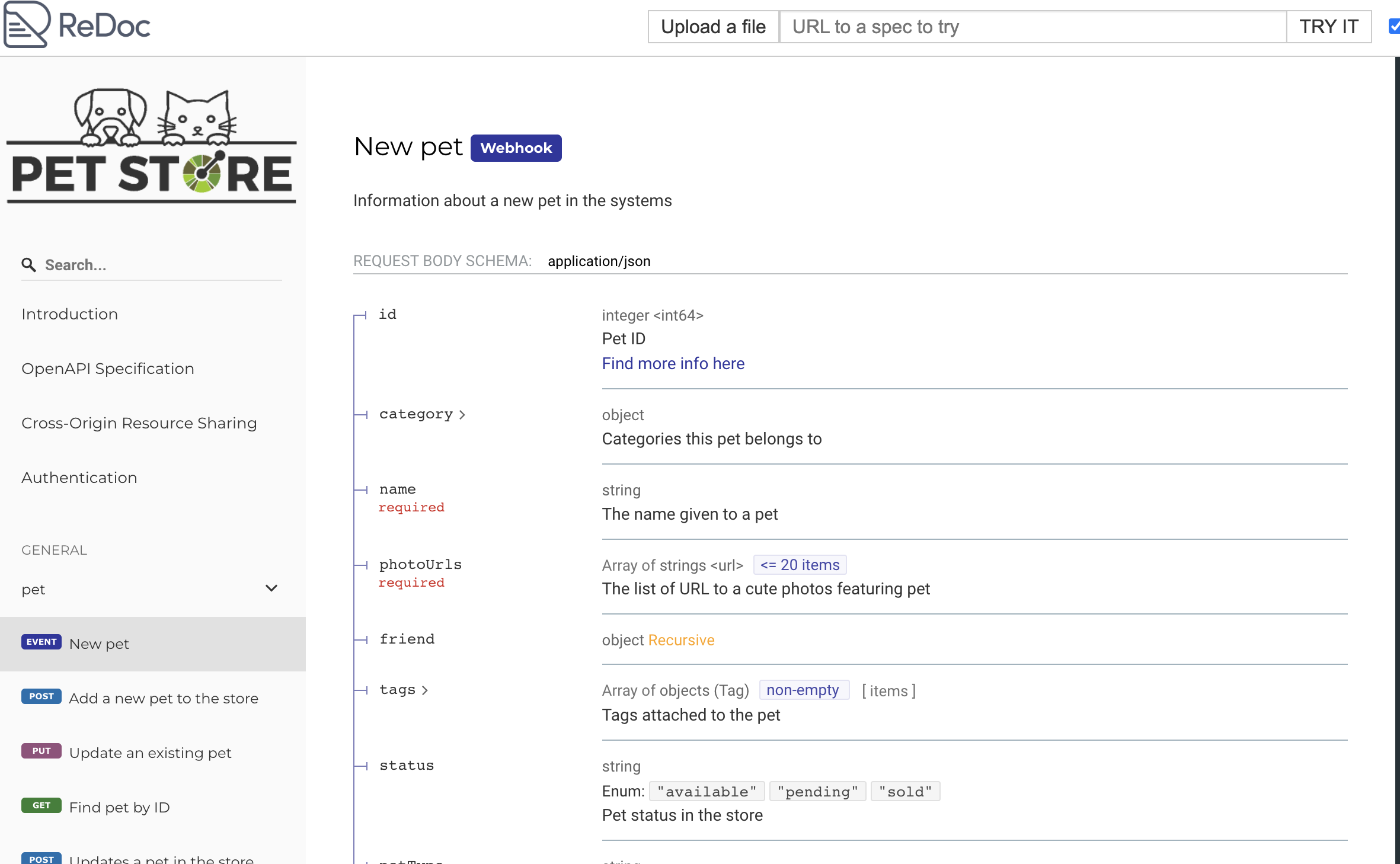 屏幕截图中显示的web钩子标记表示“新宠物”不是一个普通的API操作,而是一个web钩子。关于Redoc如何支持webhooks,请阅读这里。
