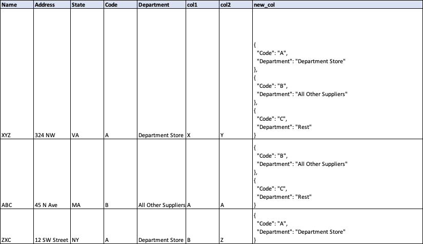 # |ABC |45 N Ave |MA |B |All Other Suppliers|A |A |{"Code":"C","Department":"Rest"},{"Code":"B","Department":"All Other Suppliers"} |