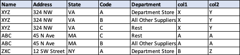 需要首先对数据进行排序。除了“代码”和“部门”列外,行1-3和4-5是重复的.因此,我希望为前3行创建new_col作为{“代码”:"A“、”部门“:”百货公司“}、{”代码“:"B”、“部门”:“所有其他供应商”}、{“代码”:"C“、”部门“:"Rest"}