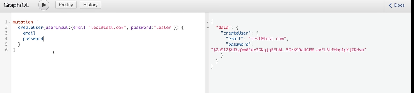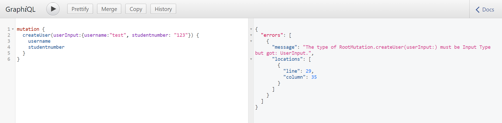 });在尝试在createUser中使用GraphiQl时,运行它们会给出以下错误消息