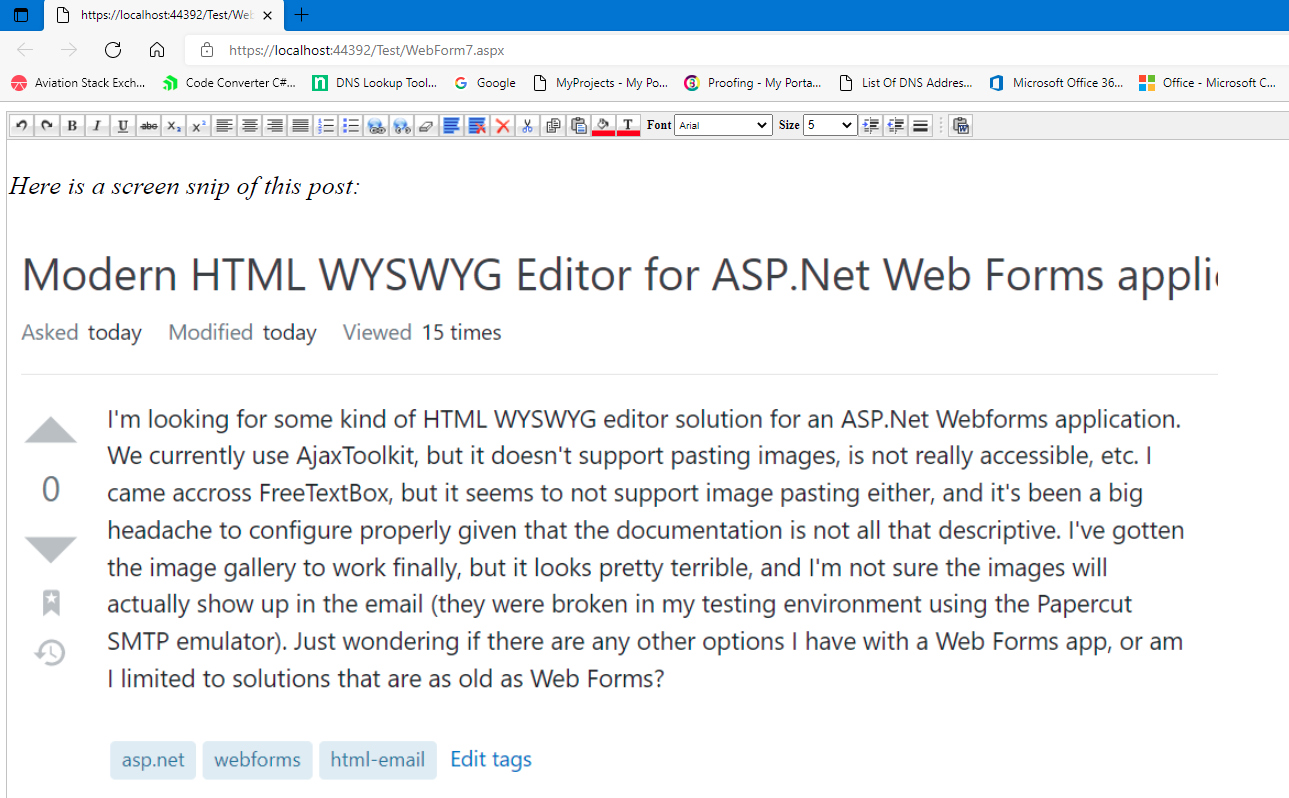 我正在为ASP.Net Webforms应用程序寻找某种HTML编辑器解决方案。我们目前使用的是AjaxToolkit,但它不支持粘贴图像,也不支持真正的可访问性,等等。我研究了FreeTextBox,但它似乎也不支持图像粘贴,而且考虑到文档并不完全是描述性的,正确配置也是一个非常棘手的问题。我终于让图像库开始工作了,但它看起来非常糟糕,我不确定这些图像是否真的会出现在电子邮件中(它们在我的测试环境中使用了Papercut仿真器)。只是想知道我对Web窗体应用程序是否还有其他选择,还是仅限于与Web窗体一样古老的解决方案?