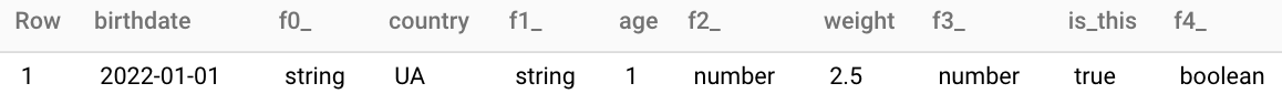 select struct(date '2022-01-01' as birthdate, 'UA' as country, 1 as age, 2.5 as weight, true as is_this) s