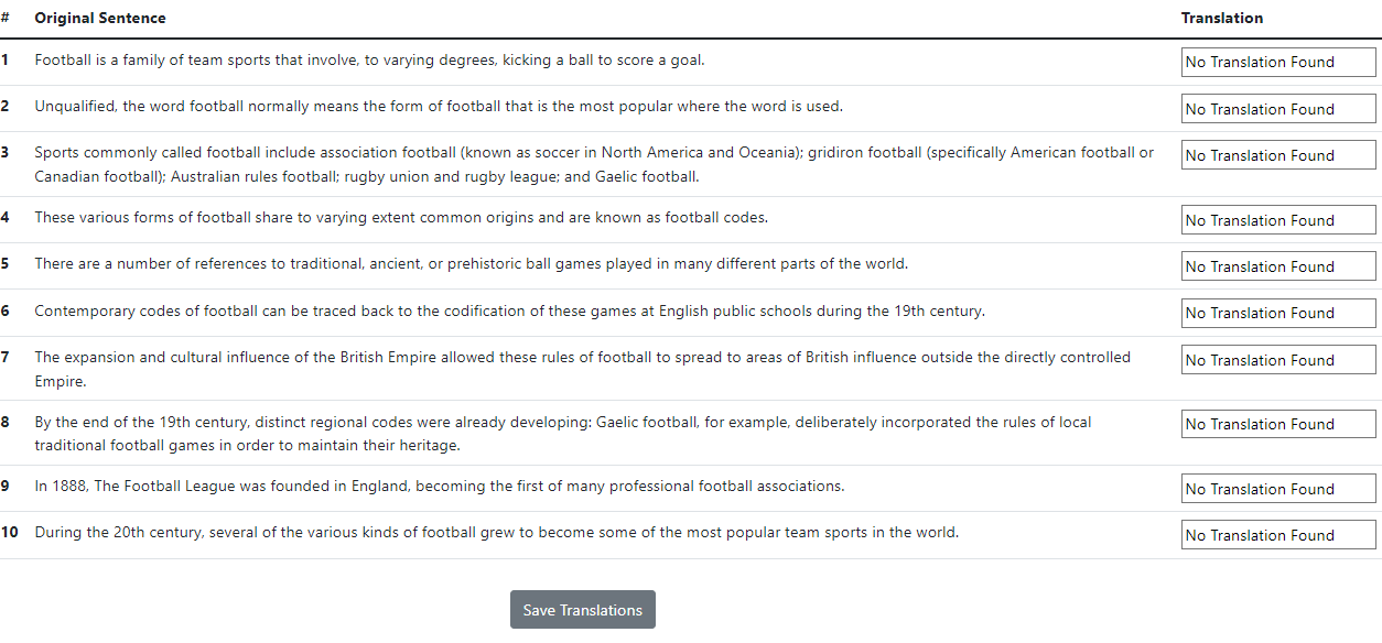 <!-- Table to Display the original sentence and take the input of the translation -->