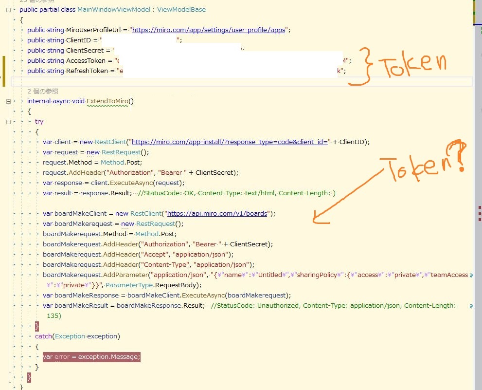 我正在VisualStudio2022社区中构建一个.NET Core6.0WPF应用程序。我想在C#中使用Miro (https://miro.com) API创建一个板。我已经获得了CliendID和ClientSecret的认证。我在RestSharp中添加了NuGet,并编写了下面的代码。它一直到认证。