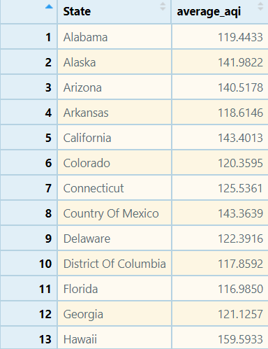 average_aqi_state <- AQI_HIGH %>% group_by(State) %>% summarise(average_aqi = mean(AQI))所以我有我的平均数据,看起来: