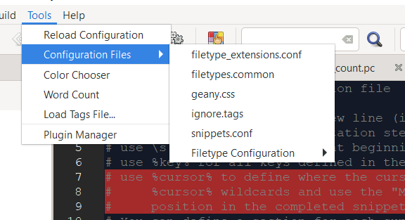 # position in the completed snippet.但是,如果要自定义代码段文件,则通常编辑自己用户的文件,可以在菜单中访问该文件:工具-配置文件- snippets.conf。
