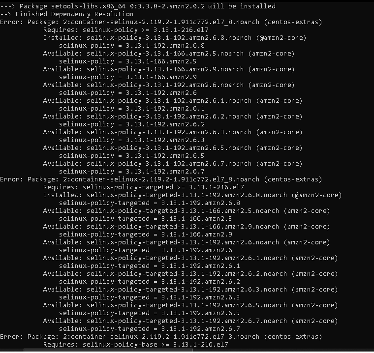 我在我的amazon 2实例上安装kubeadm有困难,特别是当我试图创建一个集群时,当我尝试安装运行时时,我选择使用哪一个运行时:容器CRI-O Docker Engine Mirantis Container,首先,我想知道我应该在它们之间使用哪一个兼容于amazon 2,而当我为任何CRI运行yum安装时,我得到同样的错误: