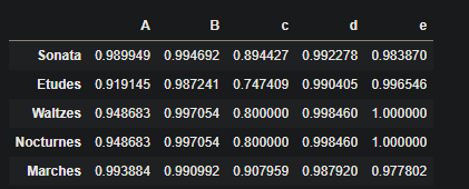 df = pd.DataFrame(cosine_similarity(a, b), columns=['A', 'B', 'C', 'D', 'E'], index=['Sonata', 'Etudes', 'Waltzes', 'Nocturnes', 'Marches'])