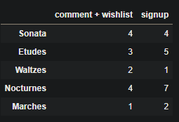 bp = pd.DataFrame(b, index=['Sonata','Etudes','Waltzes','Nocturnes','Marches'],columns=['comment + wishlist ',' signup'])