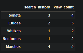 ap = pd.DataFrame(a, index=['Sonata','Etudes','Waltzes','Nocturnes','Marches'],columns=['search_history','view_count'])