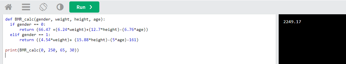 aBMR = BMR_calc(0, 250, 65, 30)发布于 2022-05-03 03:10:40