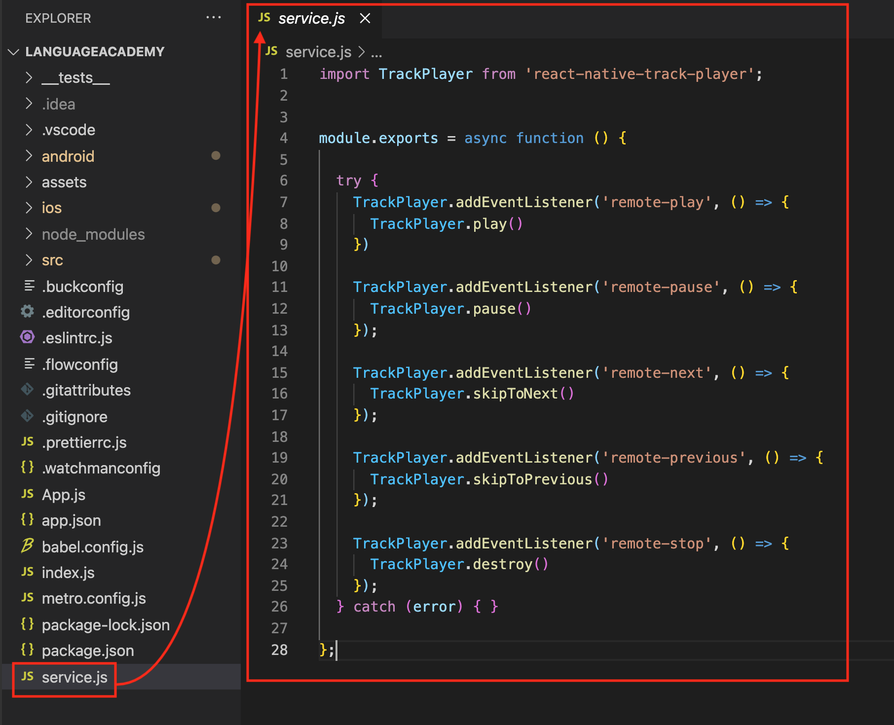 TrackPlayer.registerPlaybackService(() => require('./service.js'));我在根目录中创建了service.js文件。