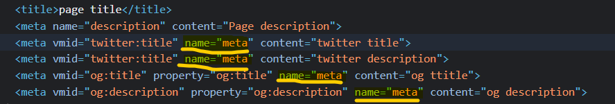 我添加了名称:'twitter:title',它显示的是name=" meta“,也显示了所有元标记的name="meta”。