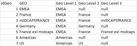 left join T T2 on T1.PARENTID = T2.idGeo;问题是,例如,第1行--我想得到geo level1 EMEA,但是我得到null。我怎样才能改正呢?