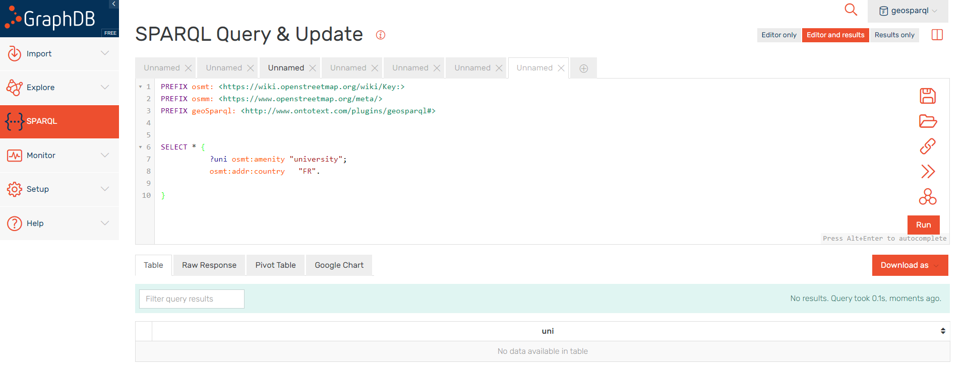 我查看了文档,并写到我们应该添加INSERT数据{ _:s geoSparql:enabled "true“。}到Graphdb中的设置,以便能够查询OpenStreetMap。但我不明白我该怎么做,在哪里做。