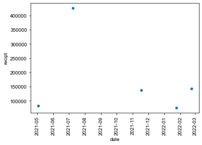 ax = df.plot.scatter(x="date",y="recipt",rot=90)